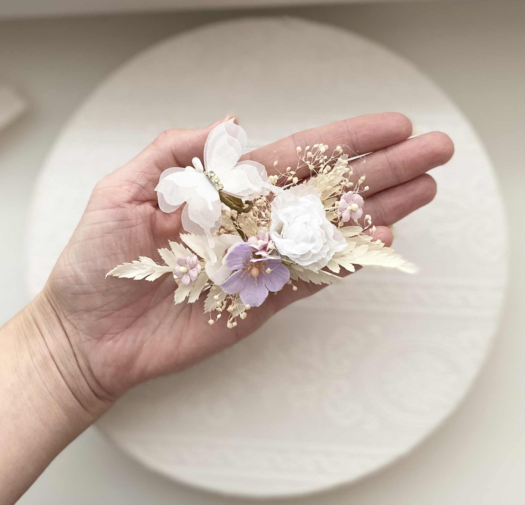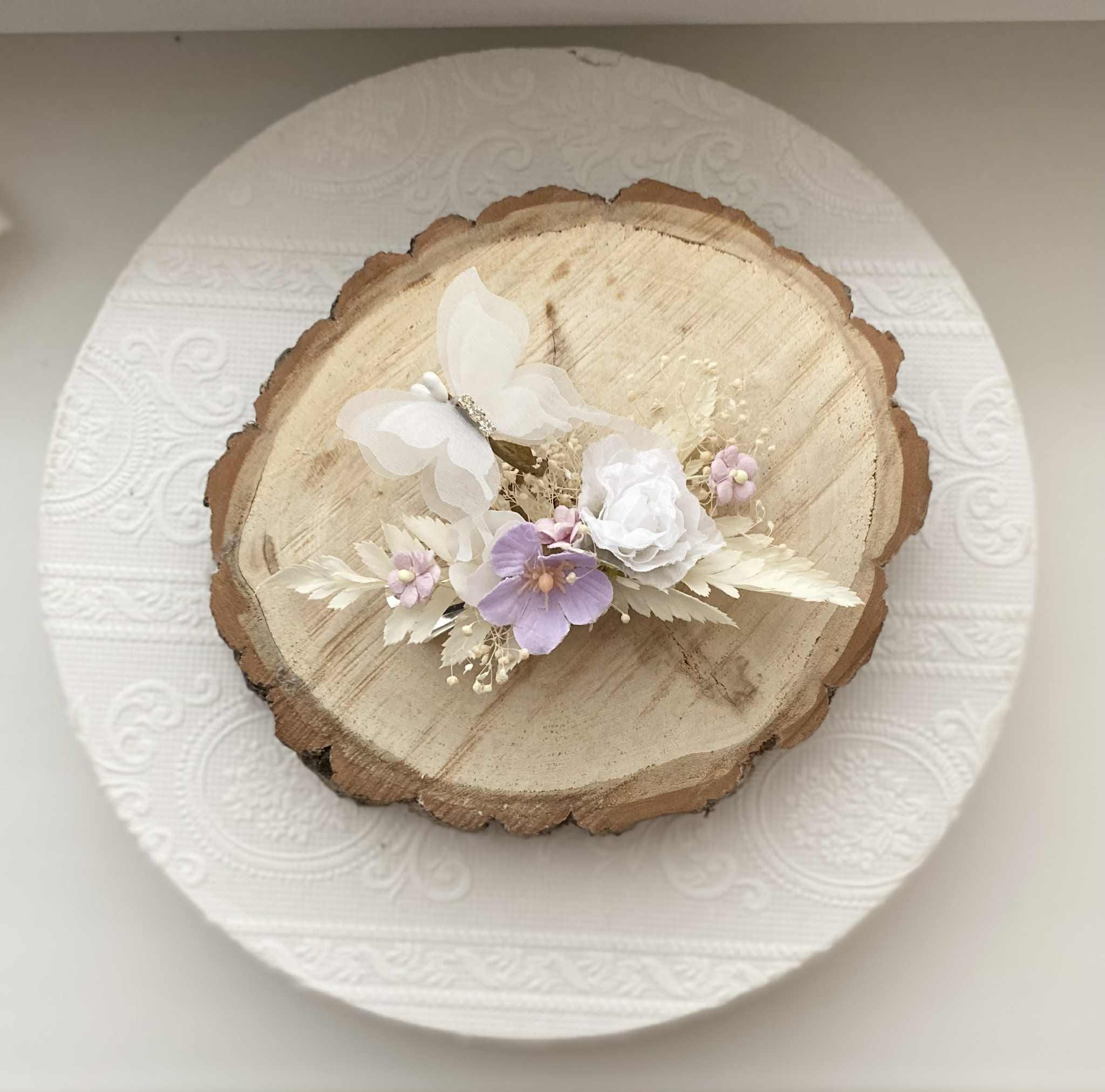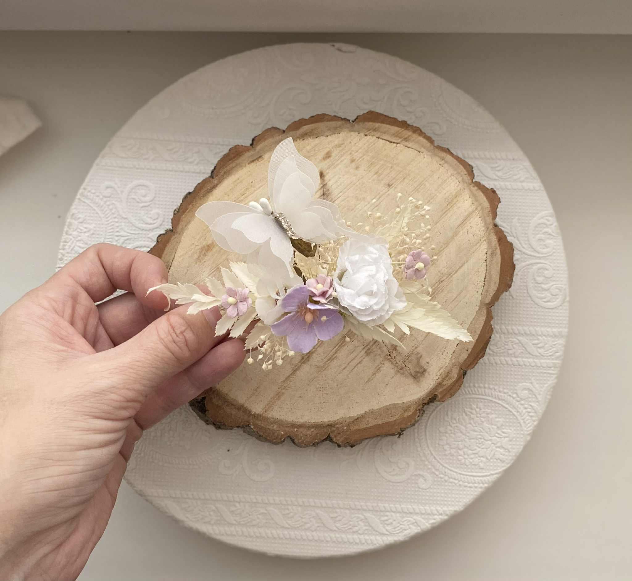 Transform your little one into a true fairy tale princess with our enchanting hair clip. This dreamy accessory features the magical effect of a flying butterfly, beautifully crafted with preserved and high-quality textile flowers, including gypsophila, fern, and roses. The metal clip ensures easy attachment to hairstyles, making it perfect for any occasion. Girls will fall in love with this delicate and whimsical design. Plus, you can request custom colors to perfectly match any outfit!