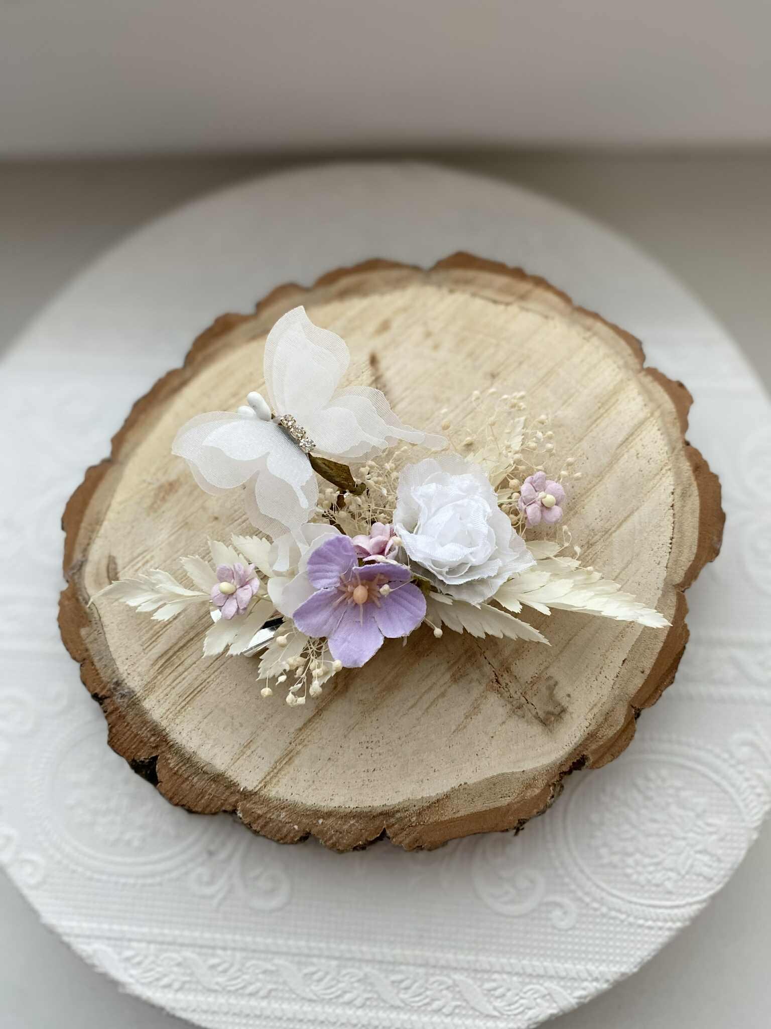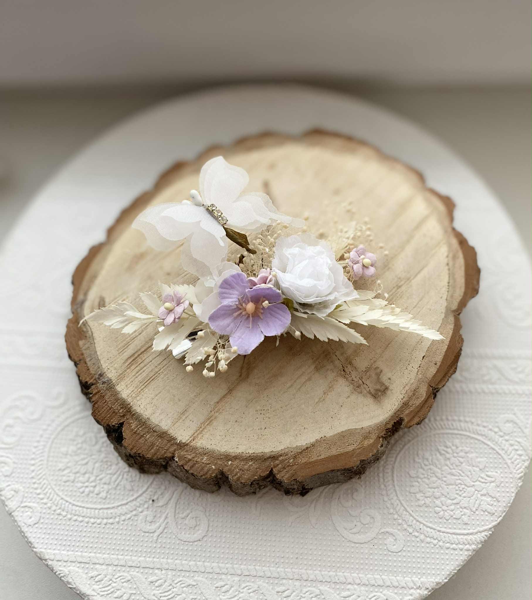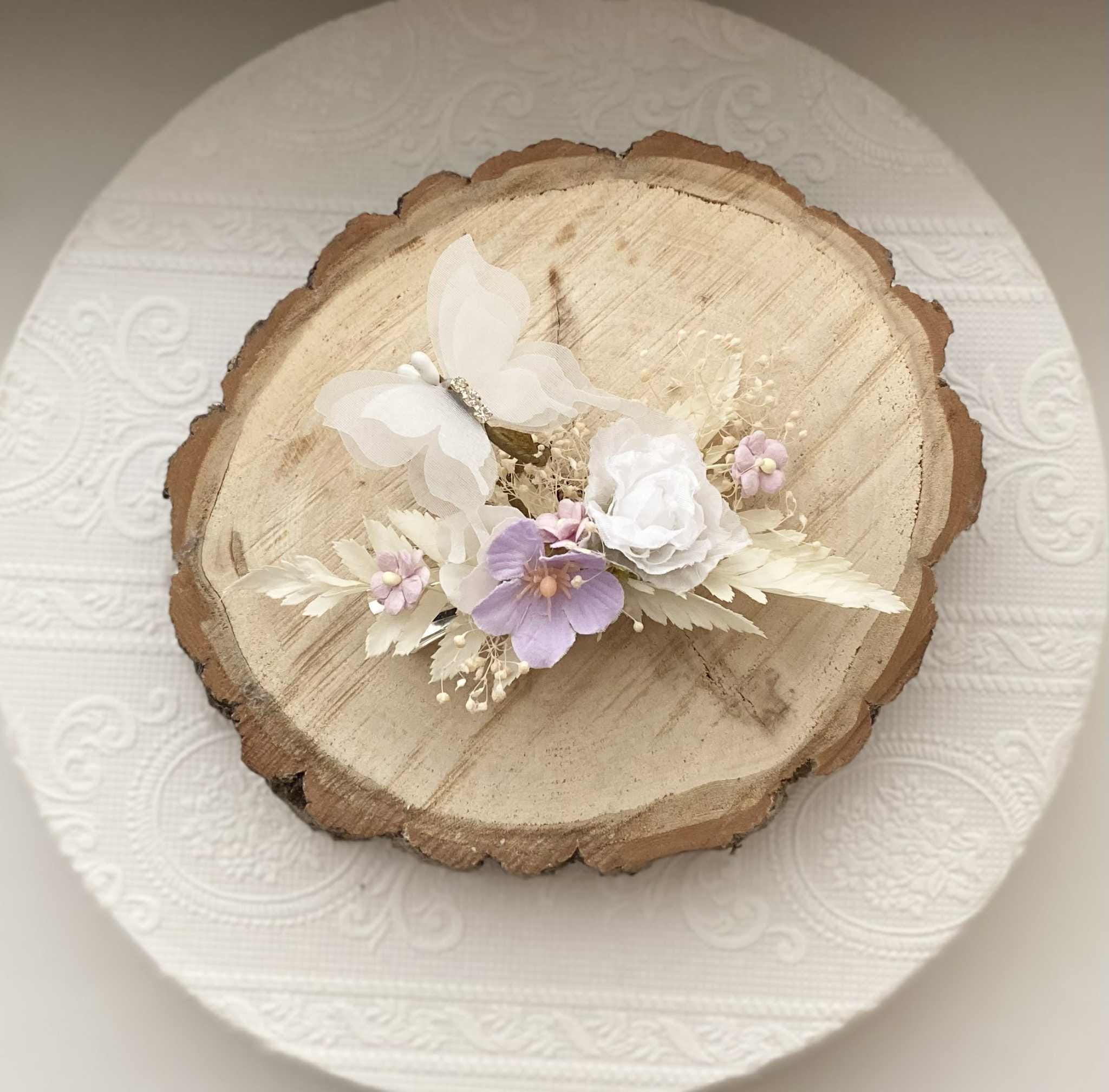 Transform your little one into a true fairy tale princess with our enchanting hair clip. This dreamy accessory features the magical effect of a flying butterfly, beautifully crafted with preserved and high-quality textile flowers, including gypsophila, fern, and roses. The metal clip ensures easy attachment to hairstyles, making it perfect for any occasion. Girls will fall in love with this delicate and whimsical design. Plus, you can request custom colors to perfectly match any outfit!