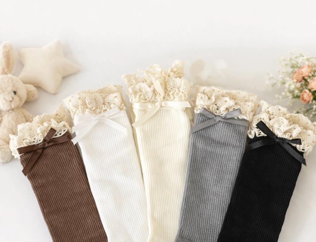 Vintage Style Knee-High Socks for Girls, wear with elegant lace trim,Gift-ready packaging included,Autumn baby gear, girl gift Baby shower