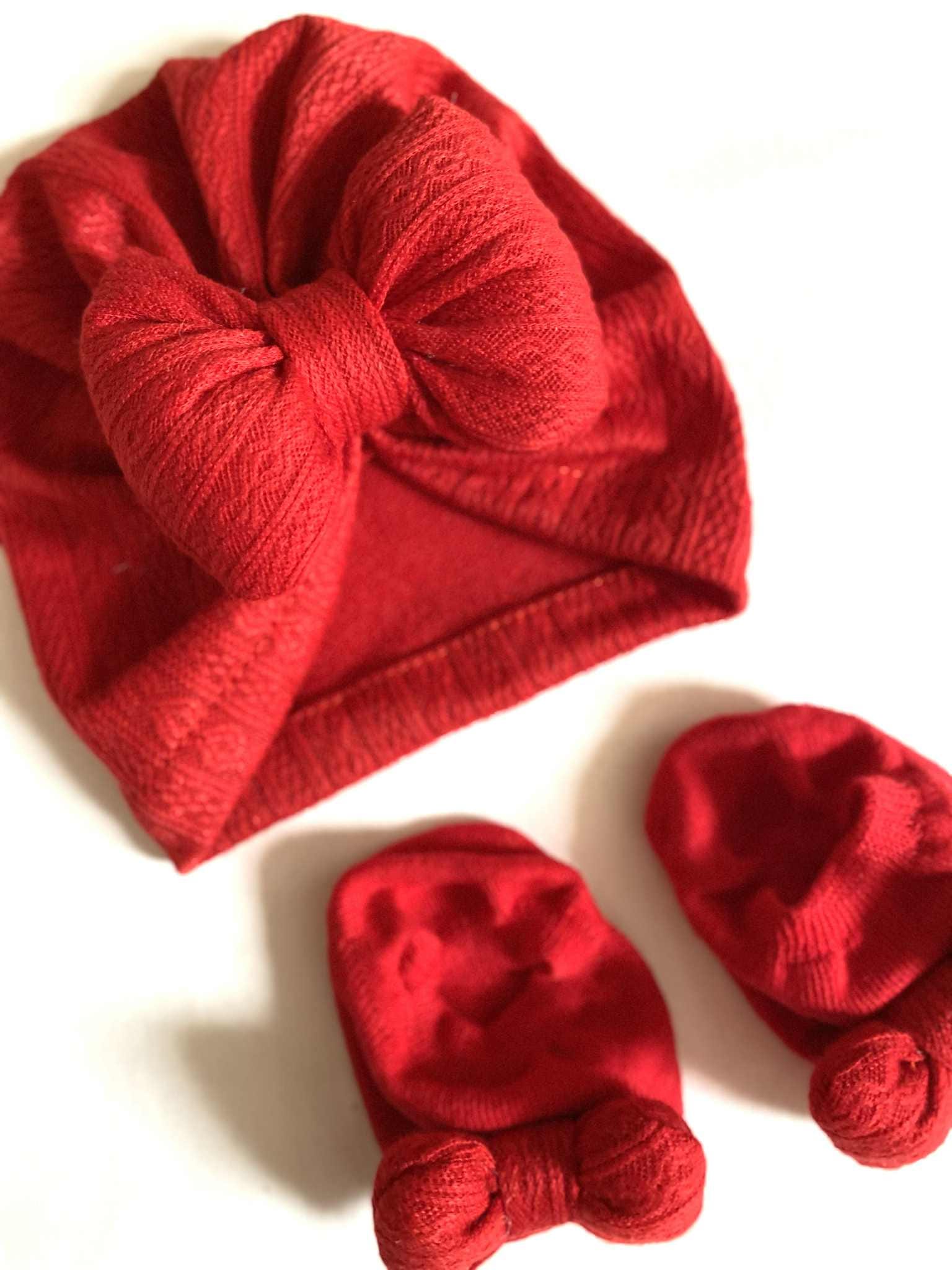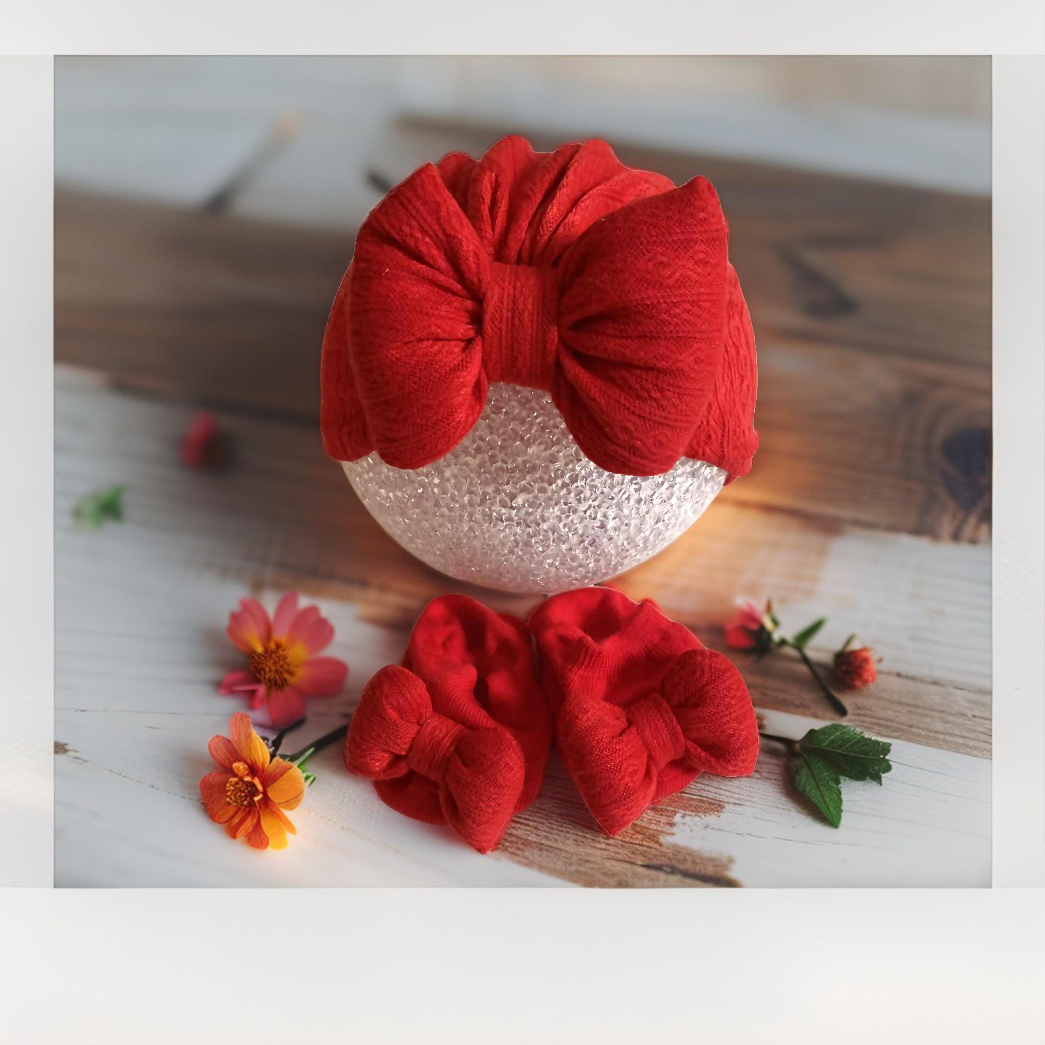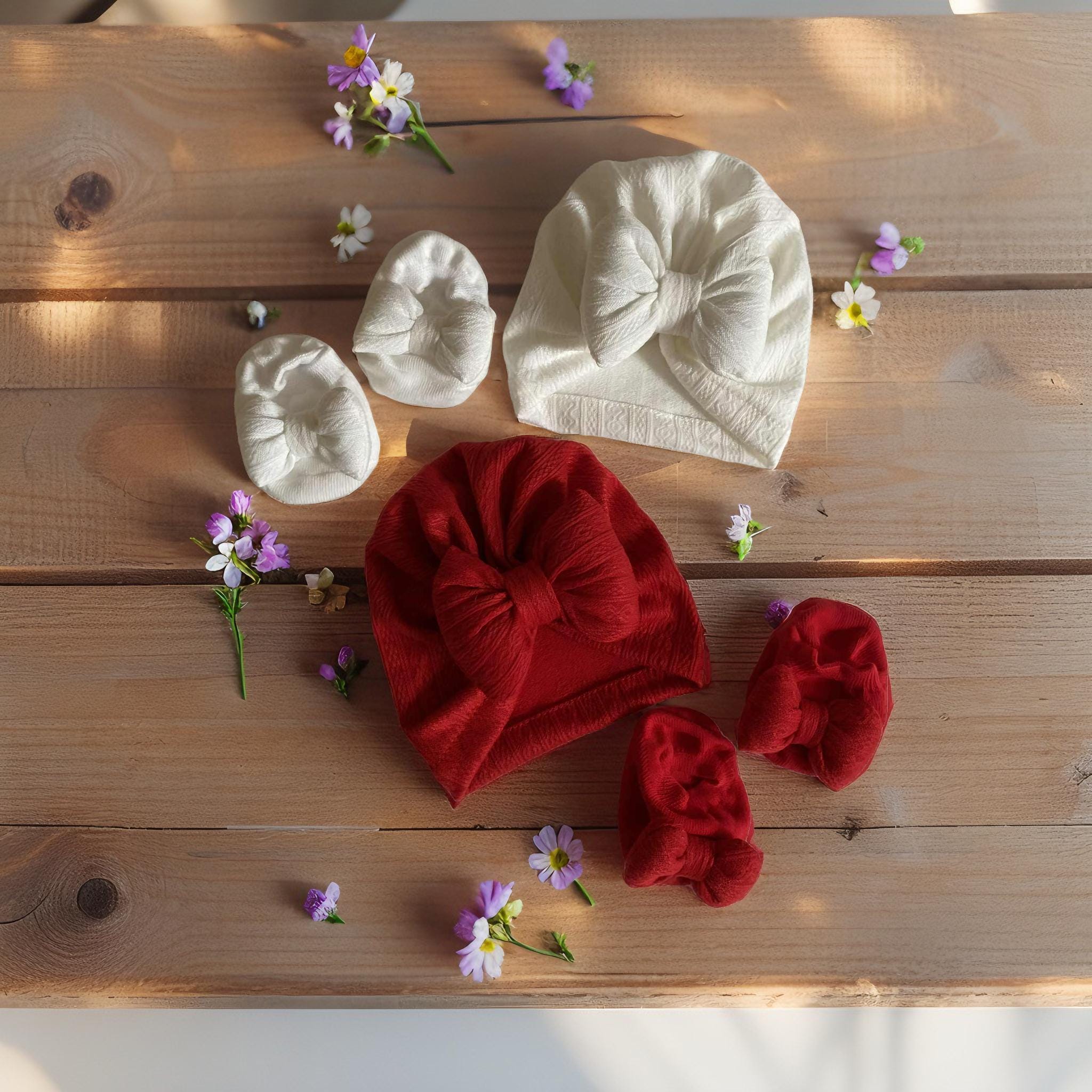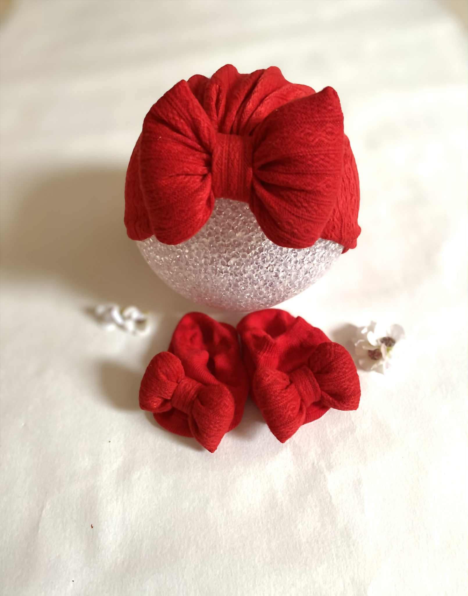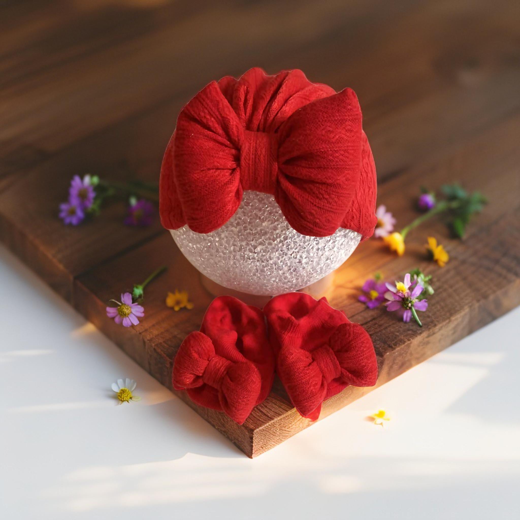 Introduce your little one to a world of charm with our Newborn Baby Girl Hat and Booties Set. This adorable set, in festive red and white, features a comfortable hat and cute booties, each adorned with a large, elegant bow. Made from soft, gentle fabric, it's ideal for Christmas or as an all-year-round accessory. It arrives beautifully packaged, making it a perfect gift choice for new parents. Care Instructions: Maintain the set's quality by hand washing with a small amount of mild soap or detergent. Avoid using a dryer to keep the fabric's integrity and elasticity intact.