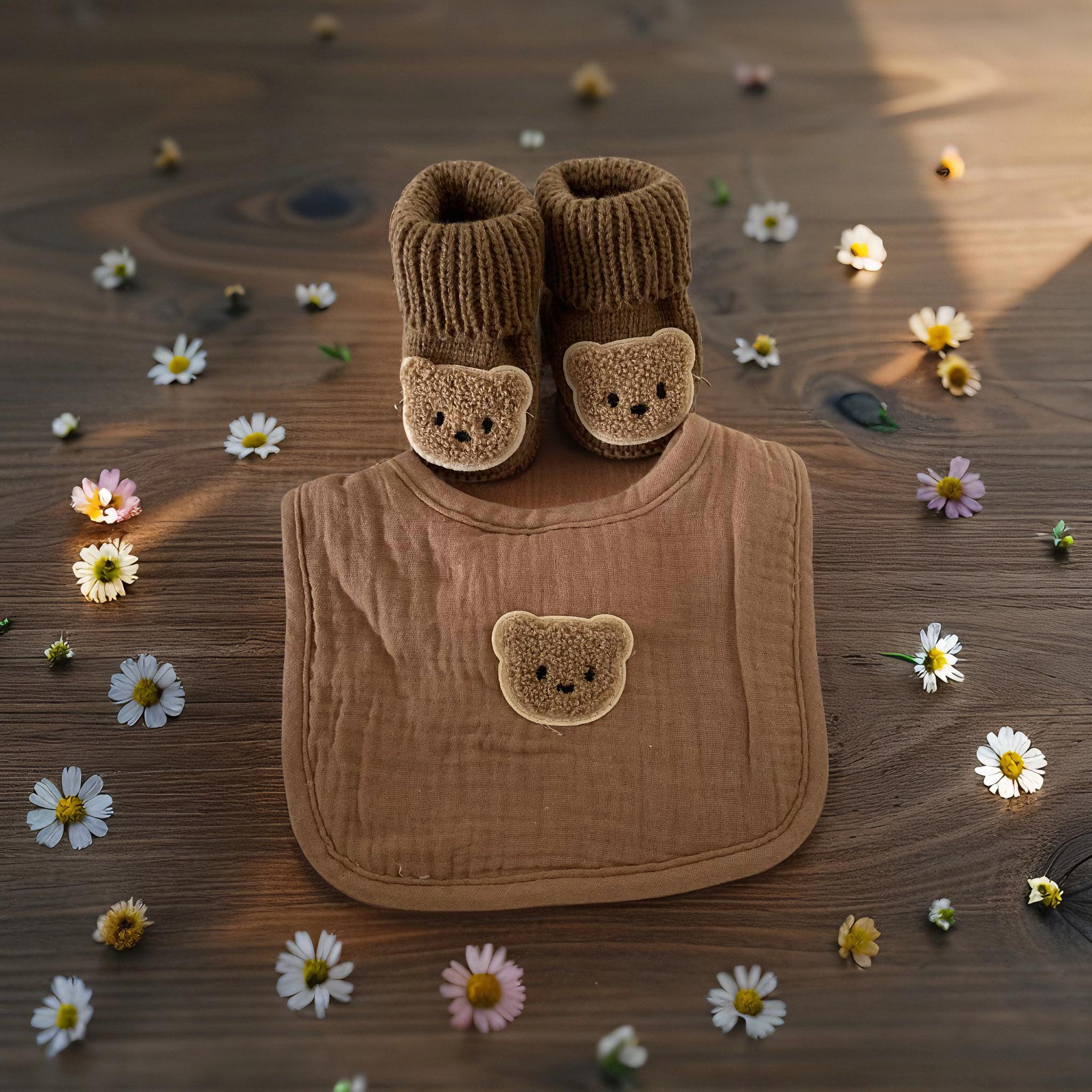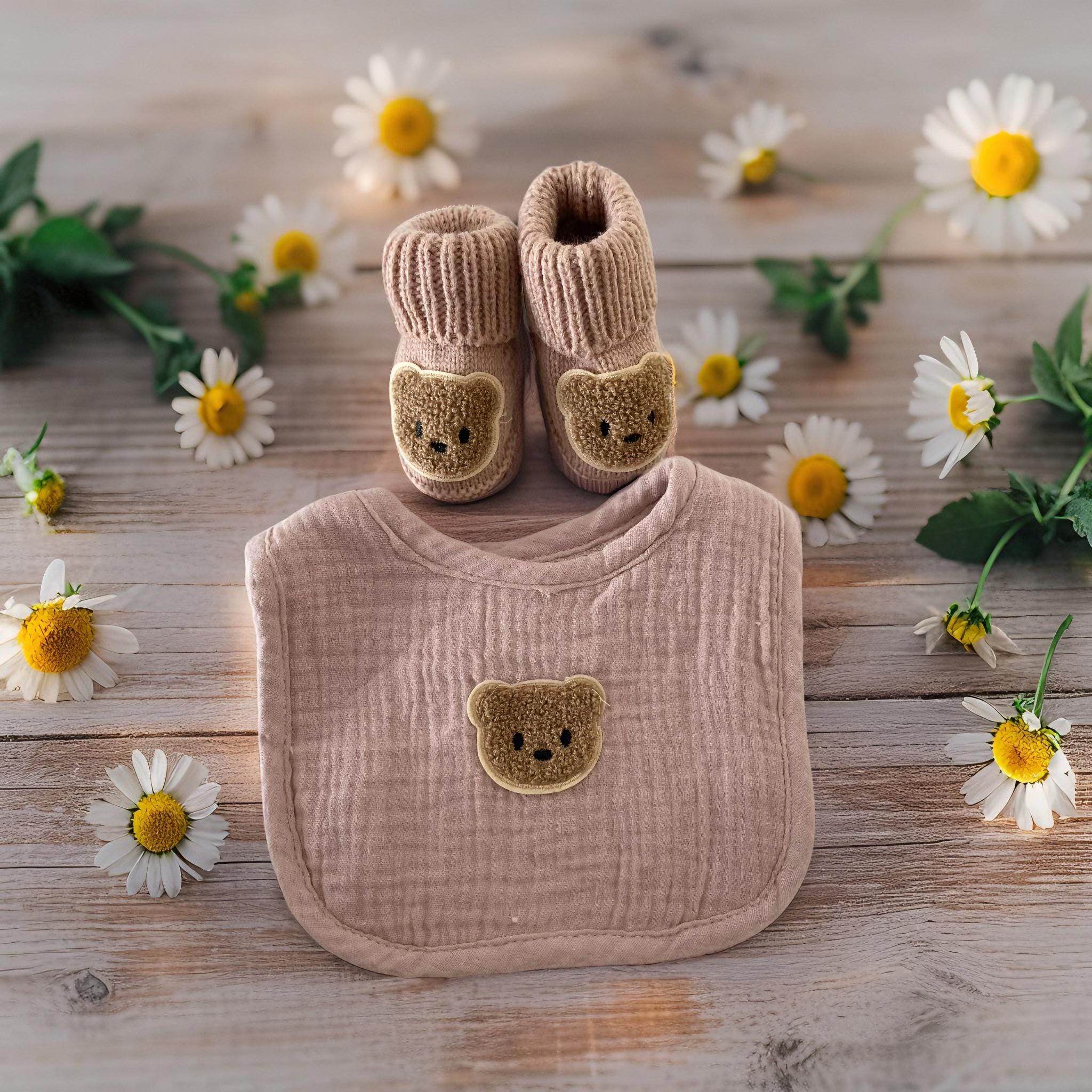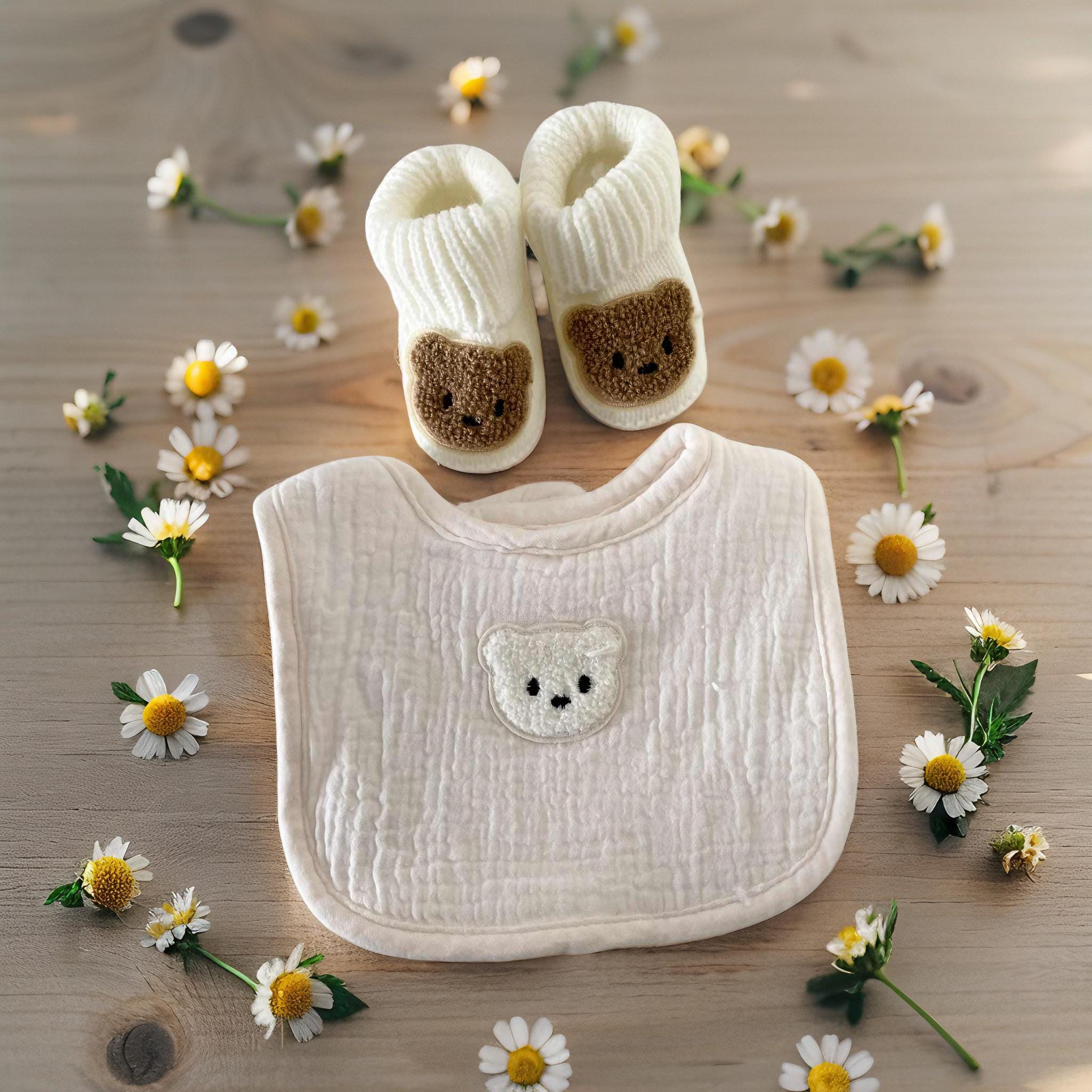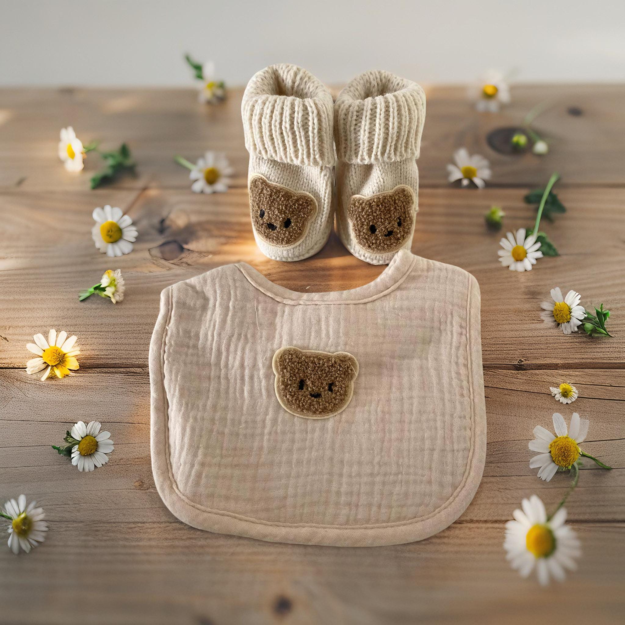 Delight in the cuteness of our Baby Bib and Knitted Booties Set with Bear Motif, perfect for both little girls and boys. The bib is fleece-lined for extra warmth, making it ideal for autumn, winter, and early spring. The cozy booties ensure your baby's feet stay snug. This charming baby set, featuring adorable bear motifs, is an excellent Christmas or all-year gift. It arrives beautifully packaged, ready to delight new parents.