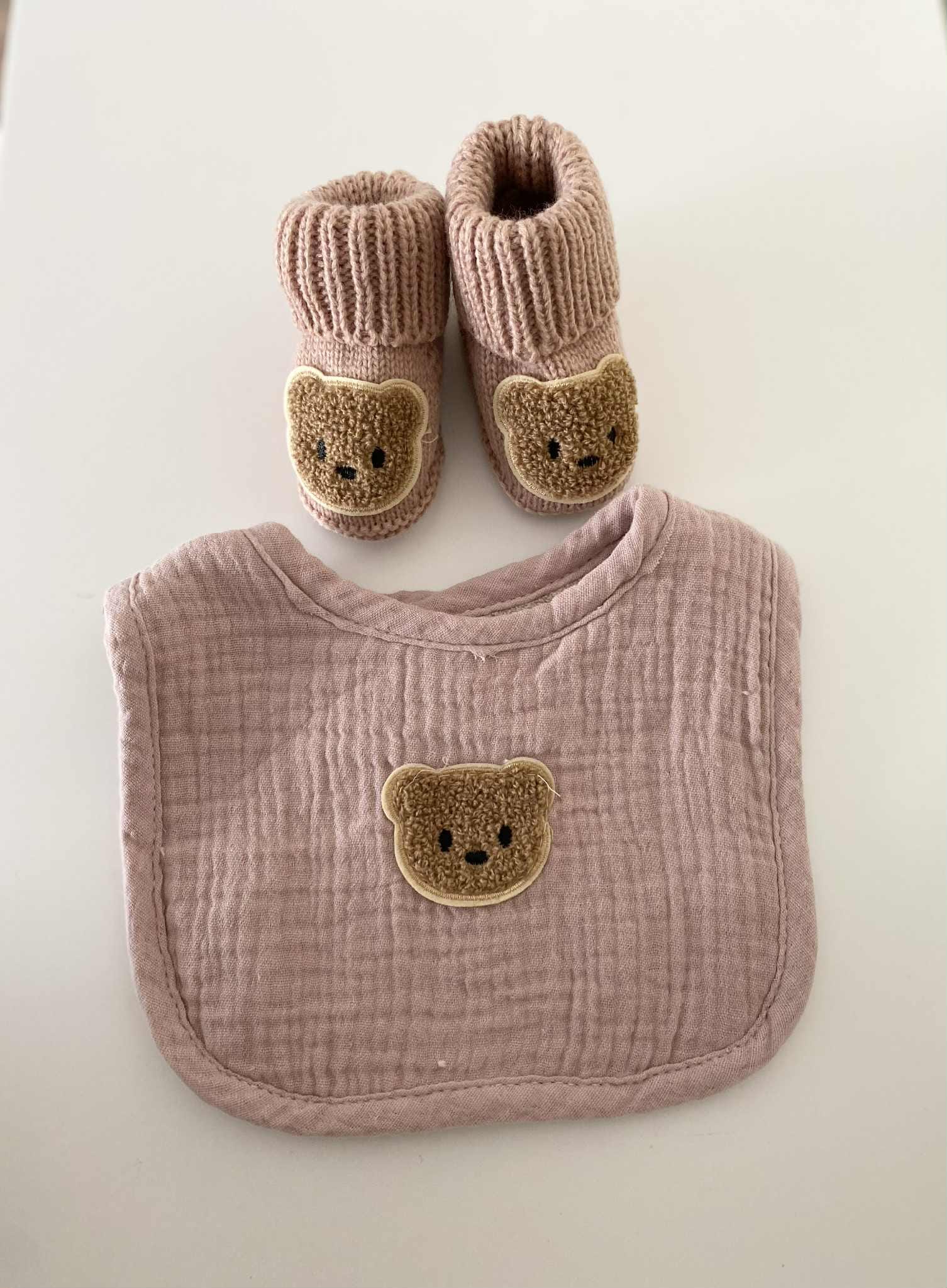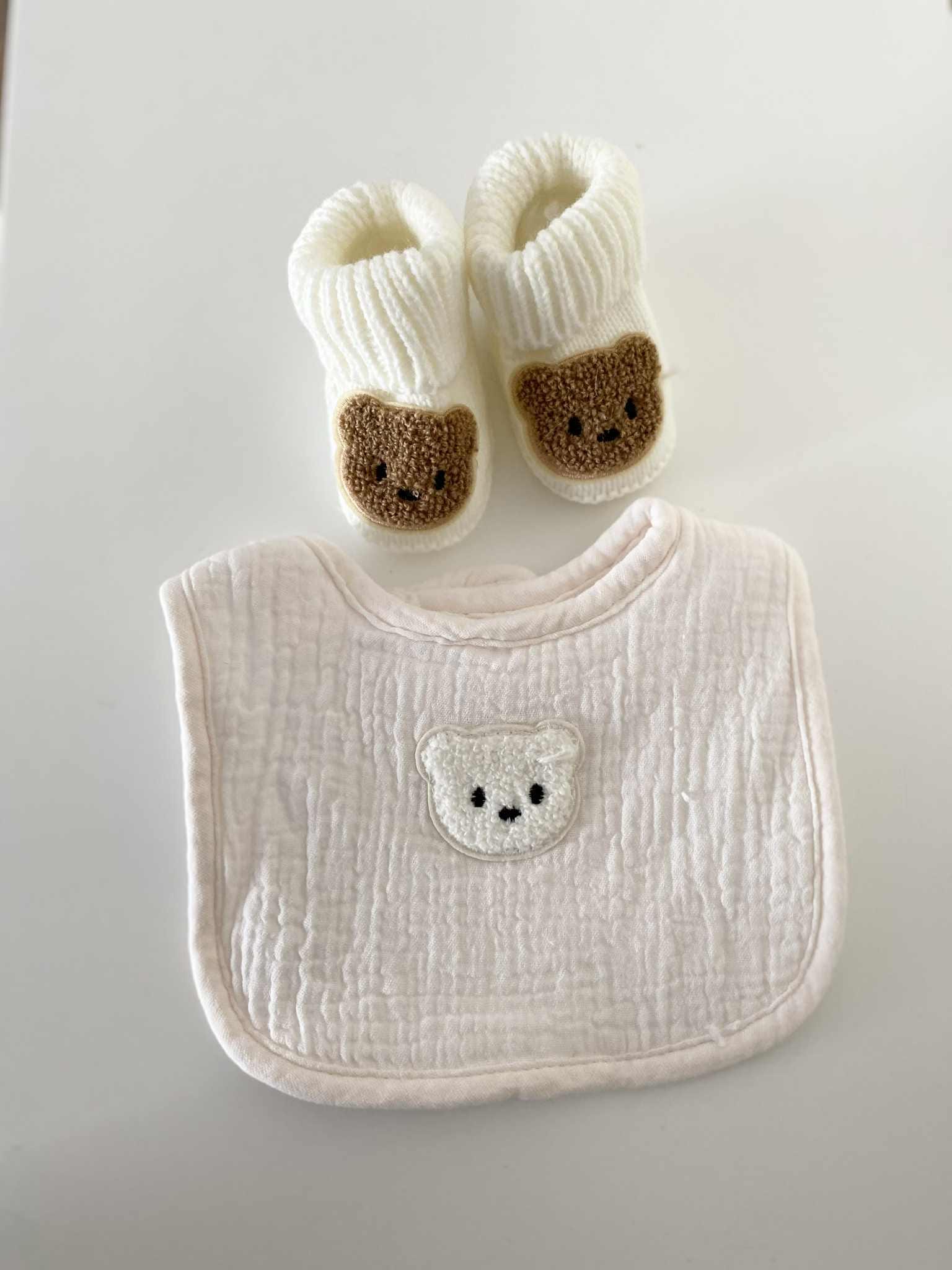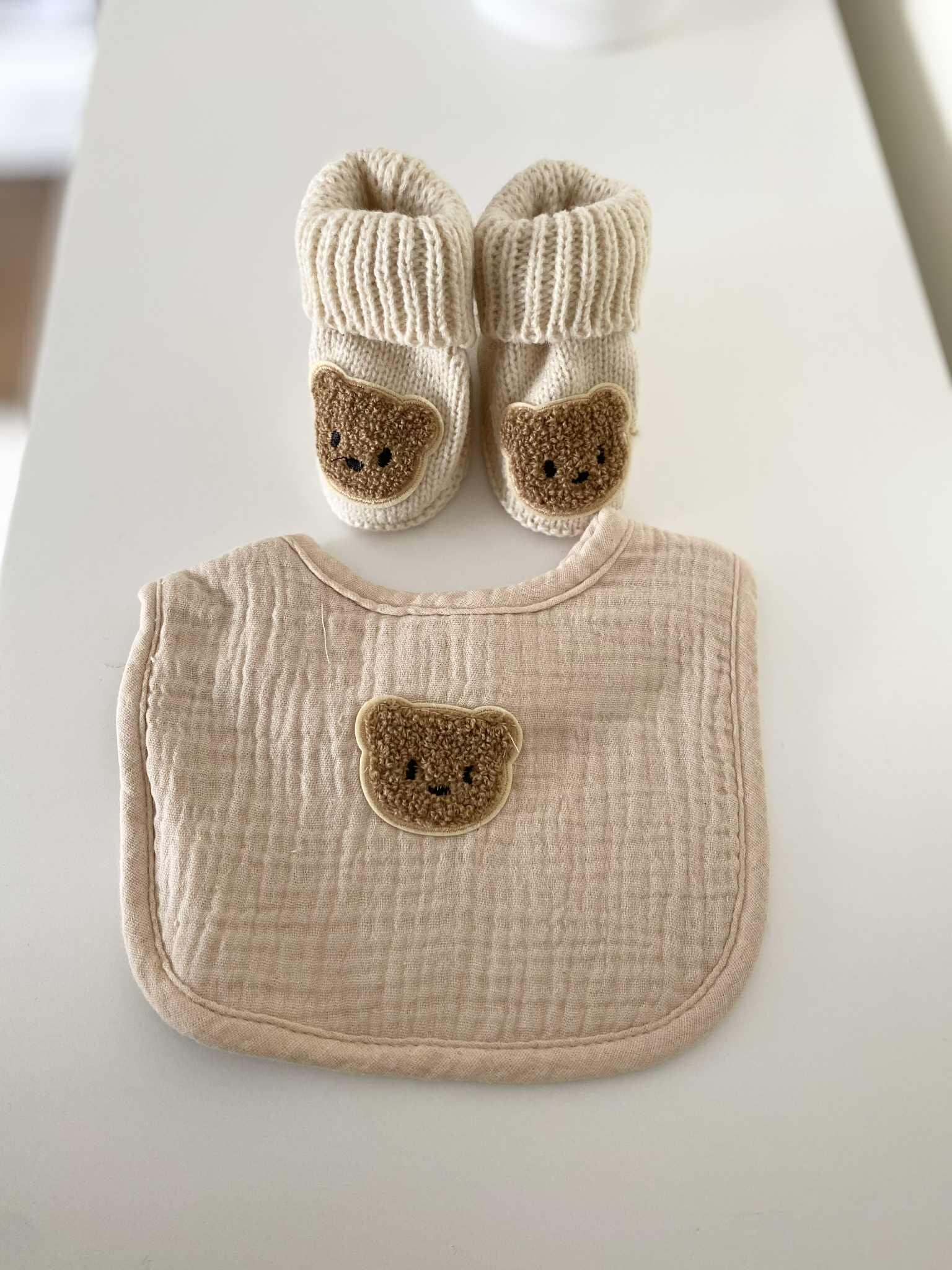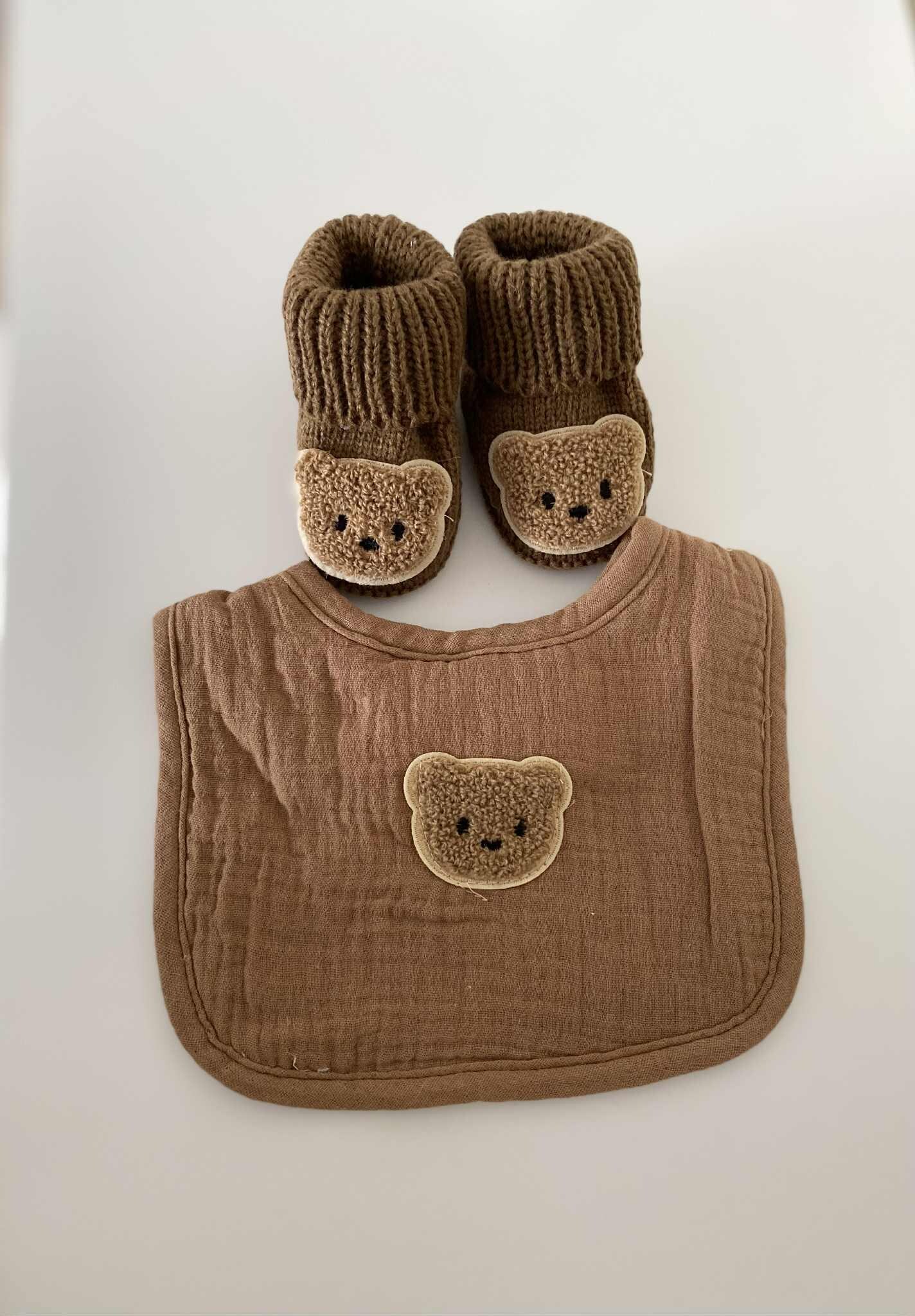 Delight in the cuteness of our Baby Bib and Knitted Booties Set with Bear Motif, perfect for both little girls and boys. The bib is fleece-lined for extra warmth, making it ideal for autumn, winter, and early spring. The cozy booties ensure your baby's feet stay snug. This charming baby set, featuring adorable bear motifs, is an excellent Christmas or all-year gift. It arrives beautifully packaged, ready to delight new parents.