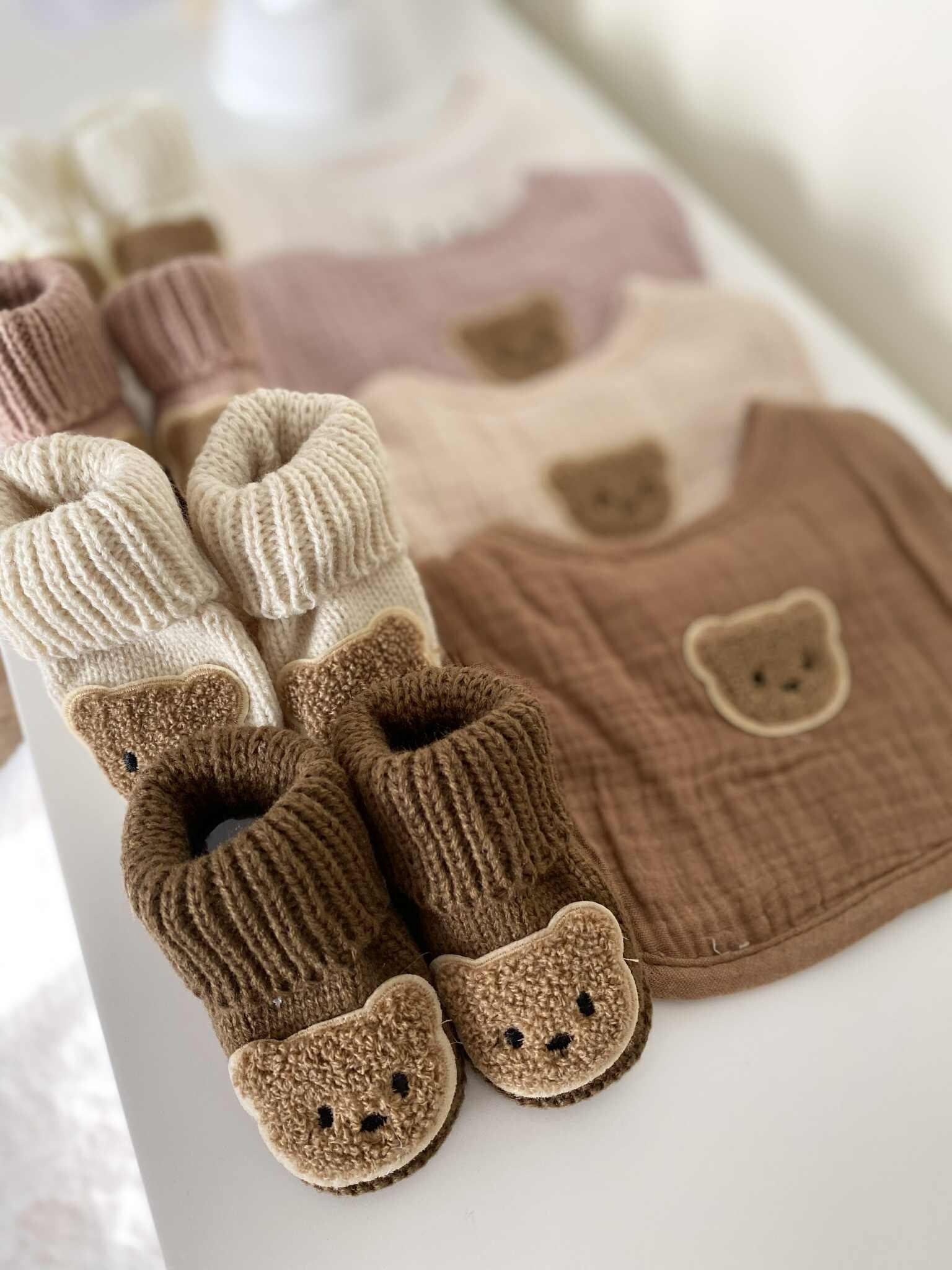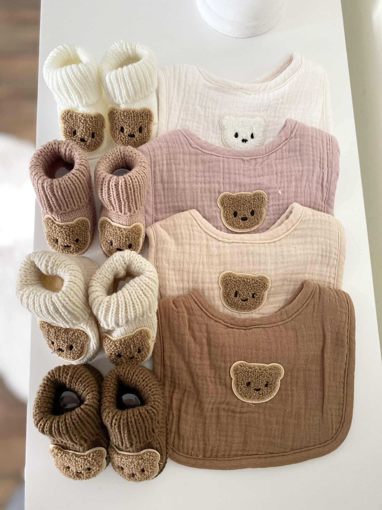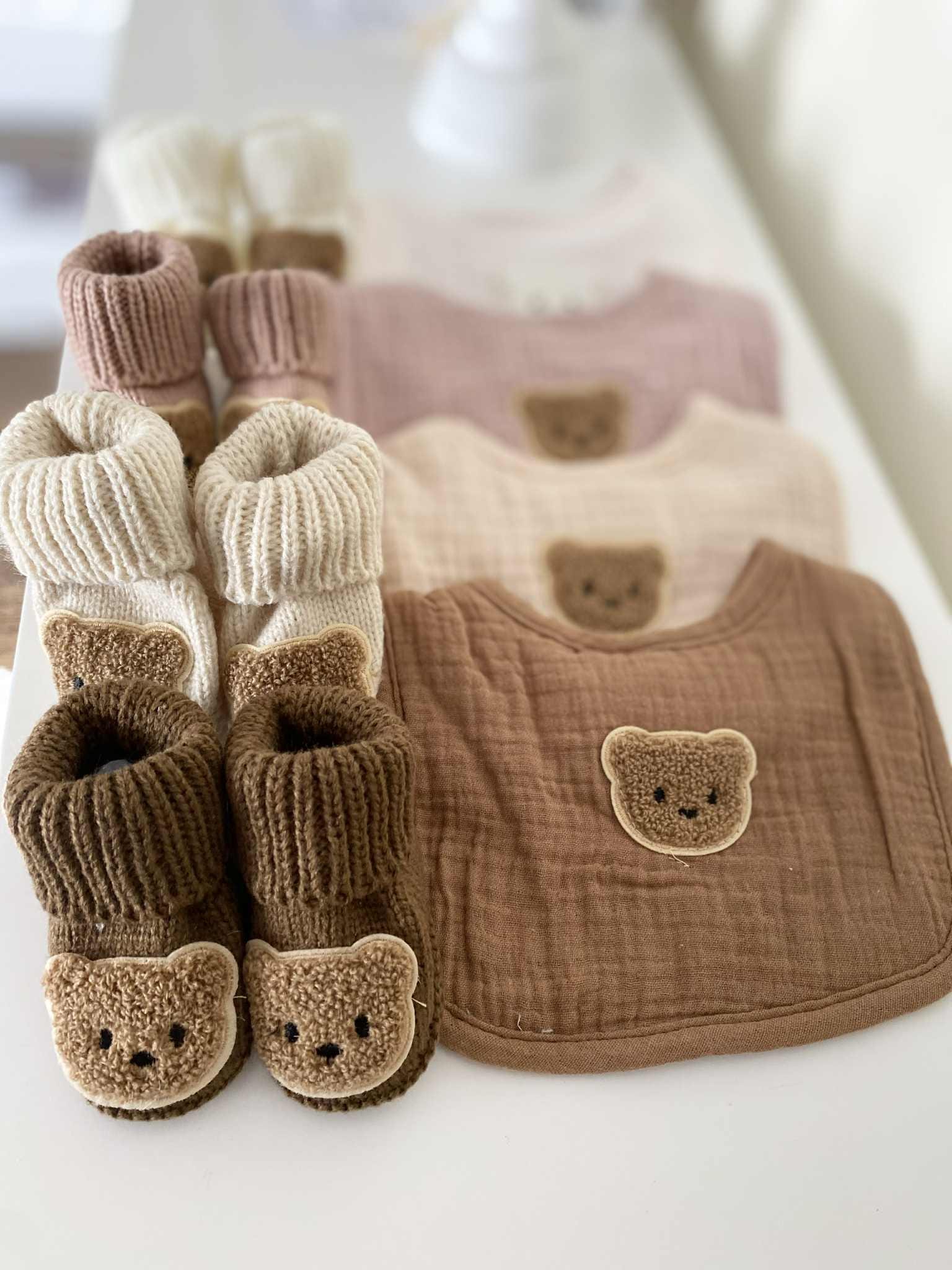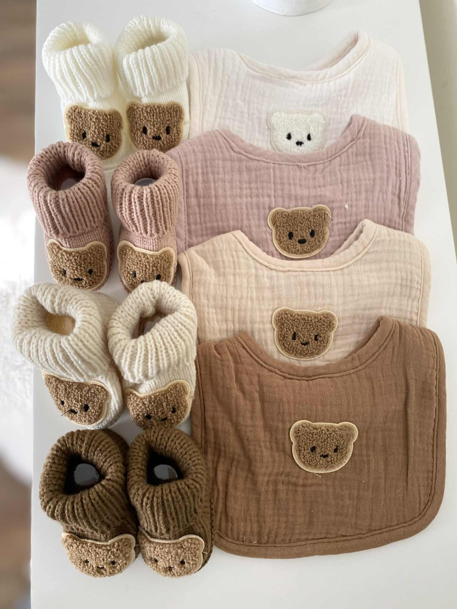 Delight in the cuteness of our Baby Bib and Knitted Booties Set with Bear Motif, perfect for both little girls and boys. The bib is fleece-lined for extra warmth, making it ideal for autumn, winter, and early spring. The cozy booties ensure your baby's feet stay snug. This charming baby set, featuring adorable bear motifs, is an excellent Christmas or all-year gift. It arrives beautifully packaged, ready to delight new parents.