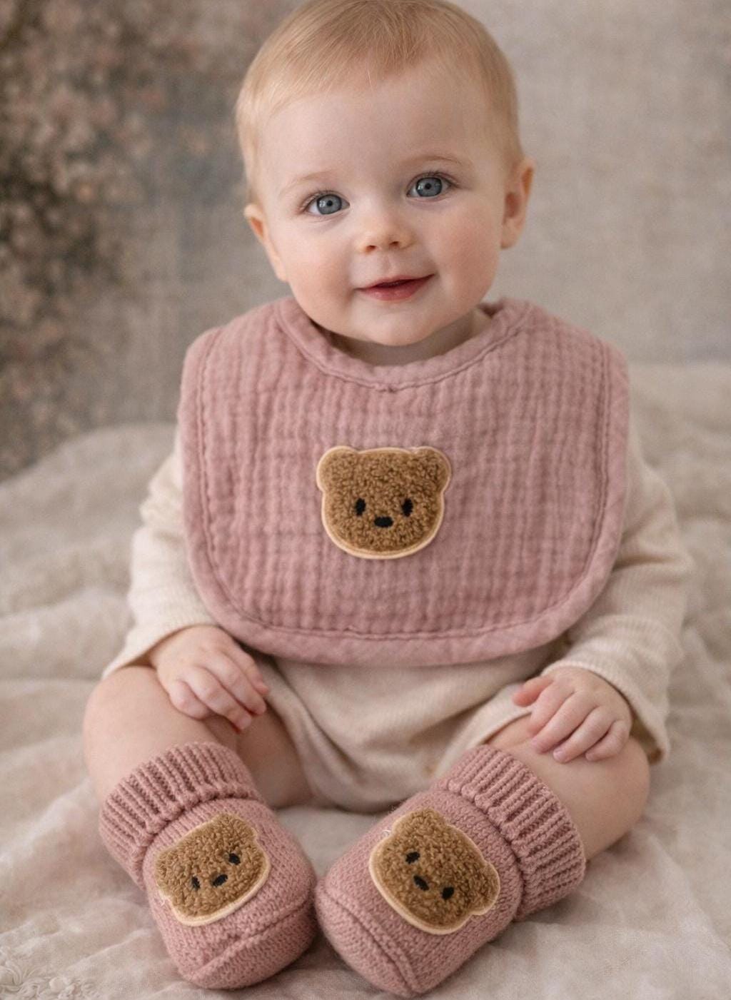 Baby Bib and Knitted Booties Set with Bear, Autumn baby gear, Baby girl and boy gift Baby shower newborn gift set knitted baby booties