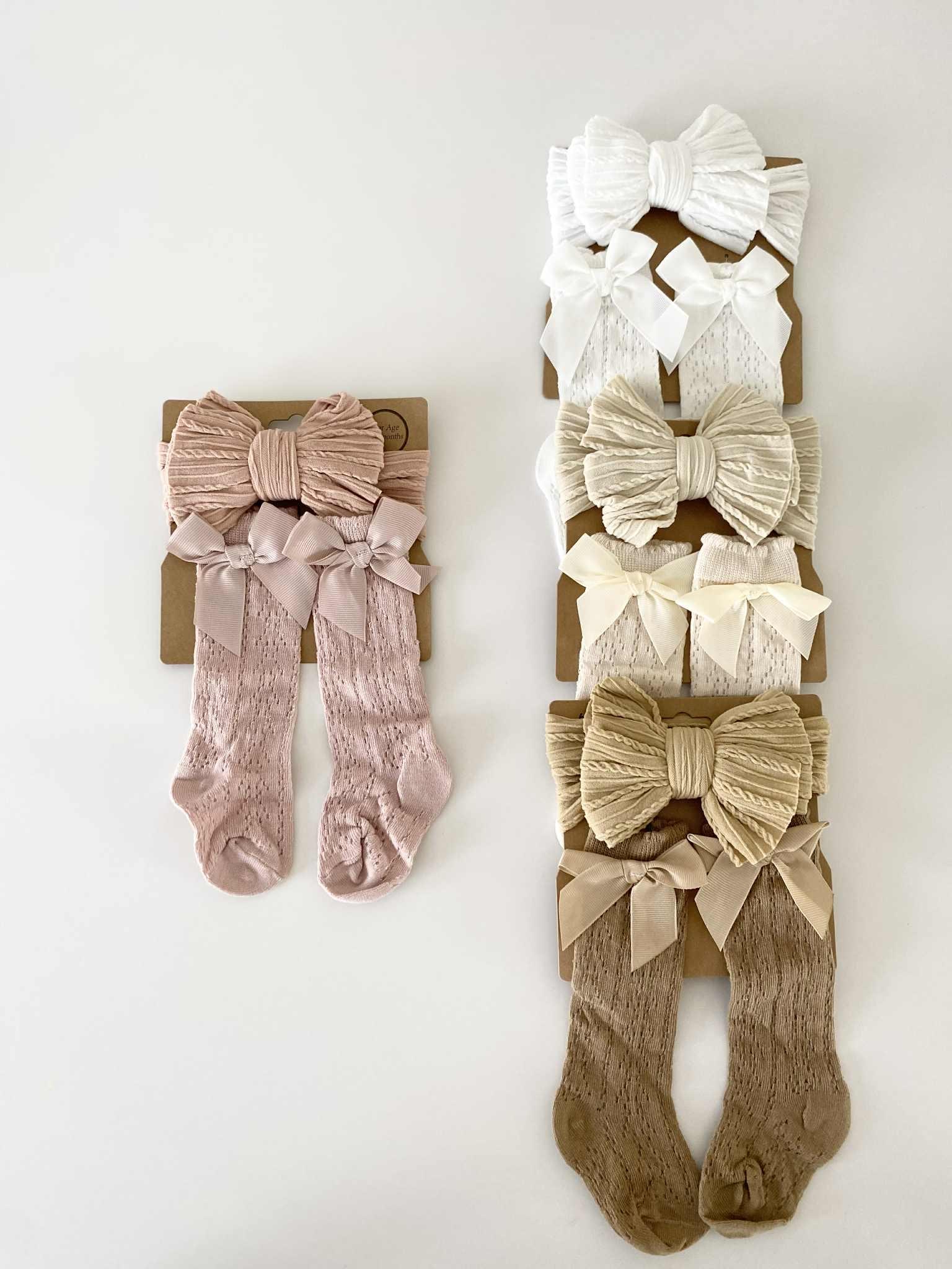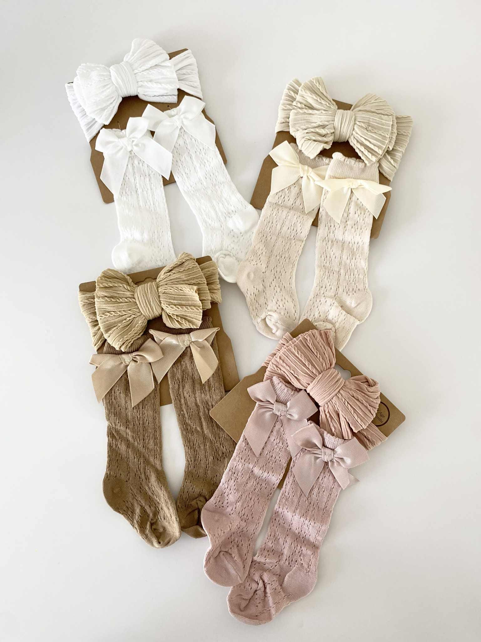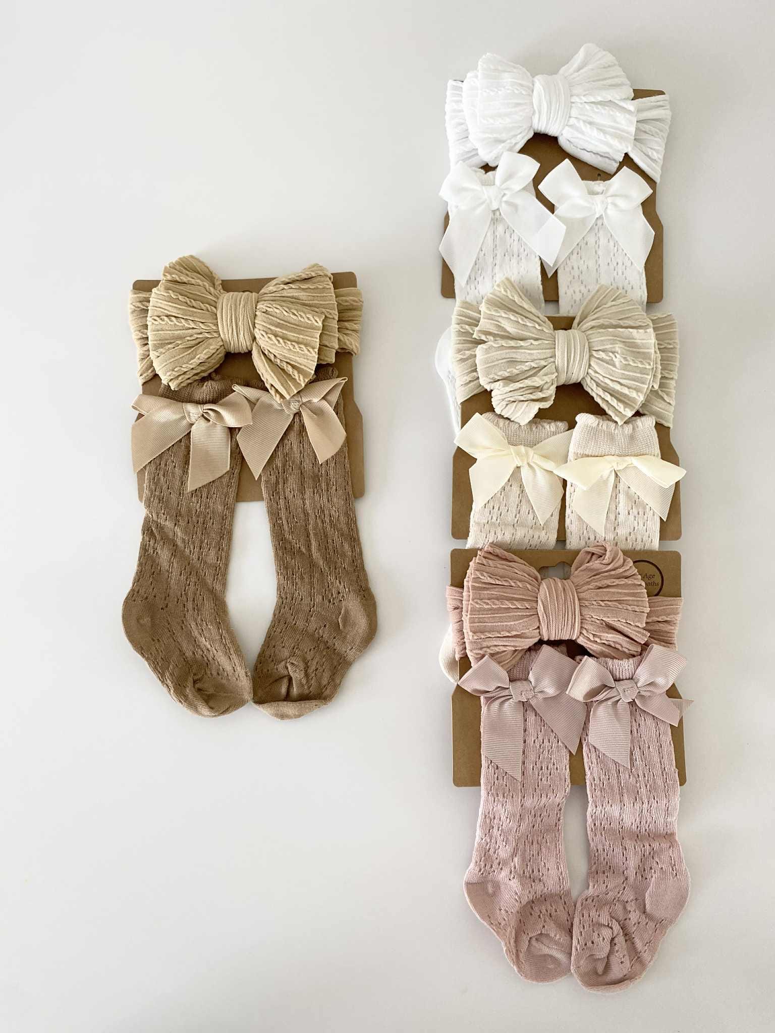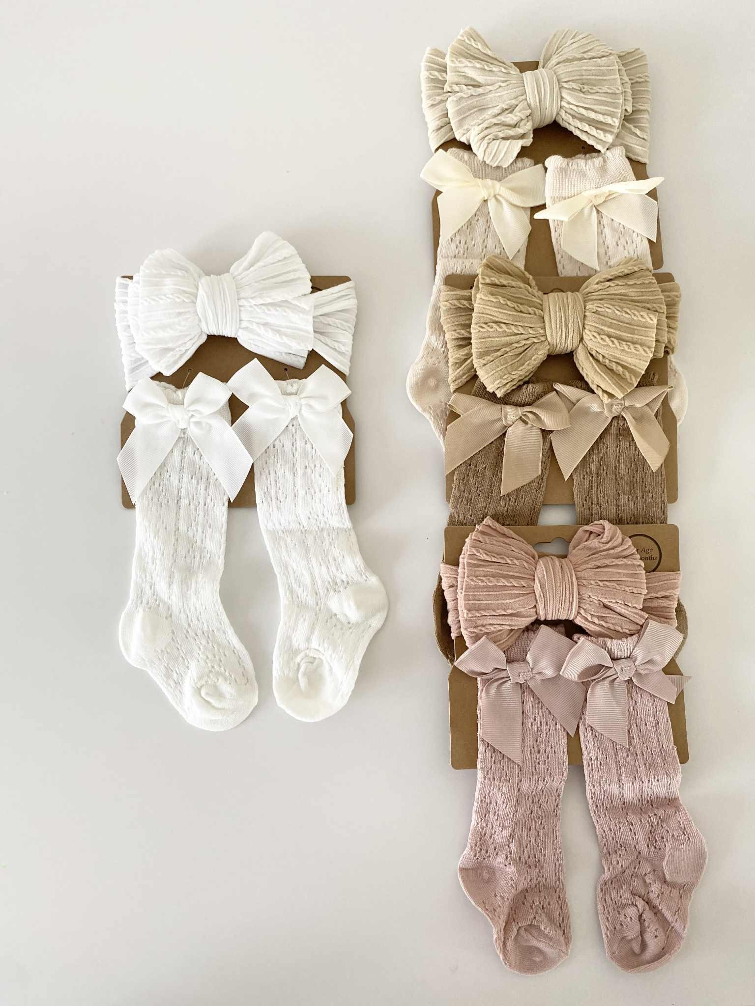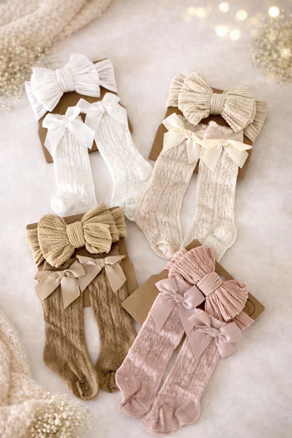 Baby Headband and Socks Set – Discover our delightful cotton (socks) set for baby girls, featuring an elastic headband and cozy socks in four earthy colors. Perfect for infants 0-12 months, this charming gift set is ideal for christenings, weddings, and baby showers. Easy hand wash care for lasting quality.
