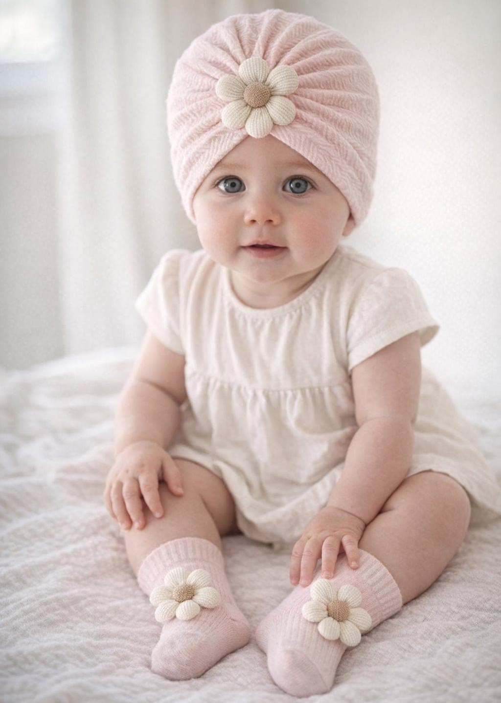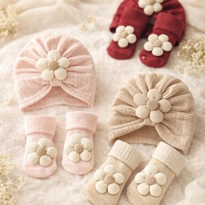 Baby Headband and Socks Set – Discover our delightful cotton (socks) set for baby girls, featuring an elastic headband and cozy flowers socks in four earthy colors. Perfect for infants 0-3 months, this charming gift set is ideal for christenings, weddings, and baby showers. Easy hand wash care for lasting quality.